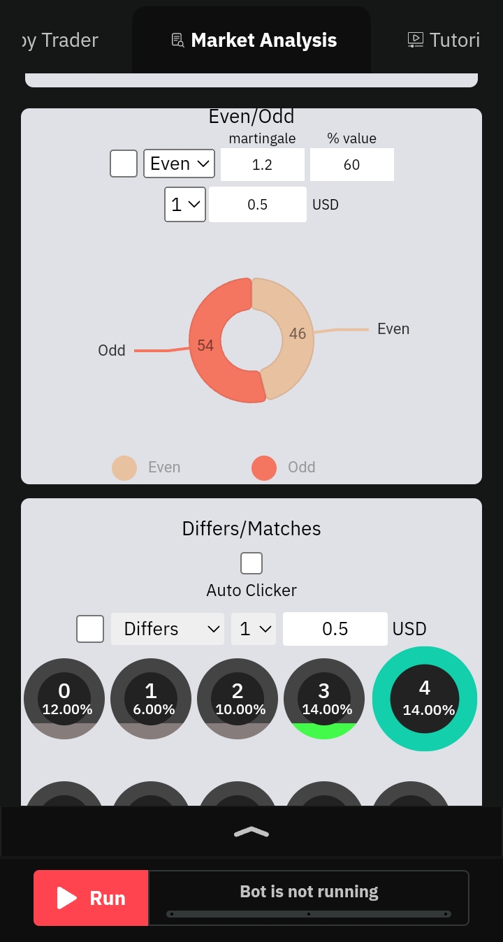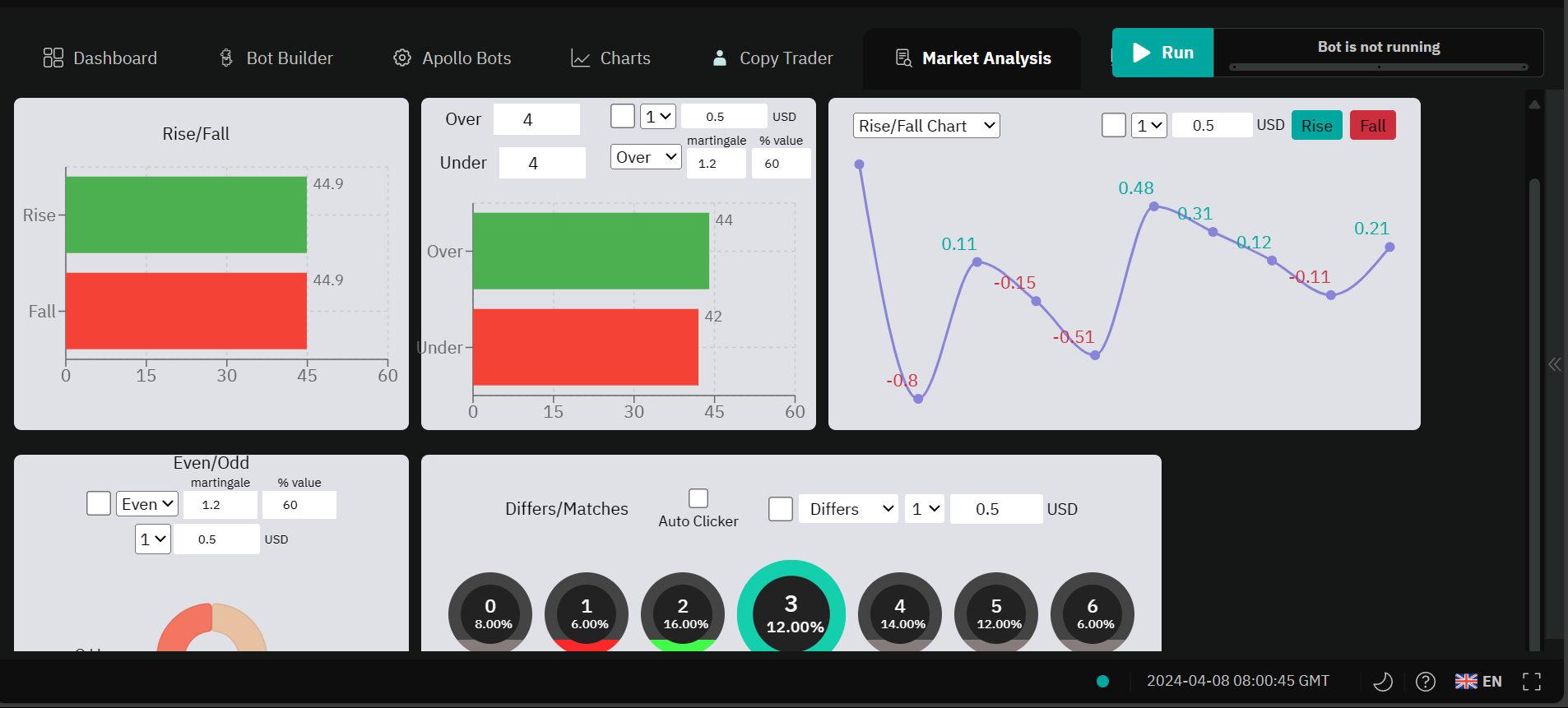 D-Apollo's analysis tool is a versatile companion for traders, offering comprehensive insights into various market dynamics. It meticulously analyzes market trends such as rise/fall, over/under, matches/differs, and even/odd scenarios, empowering users to make well-informed trading decisions.