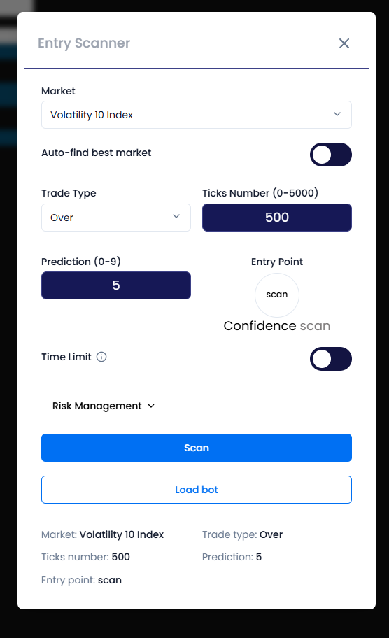 Analyze digit markets in real-time to find optimal entry points for Over/Under, Even/Odd, and Matches/Differs trading. Our advanced scanner processes up to 5000 digits to identify the best trading opportunities with built-in risk management.